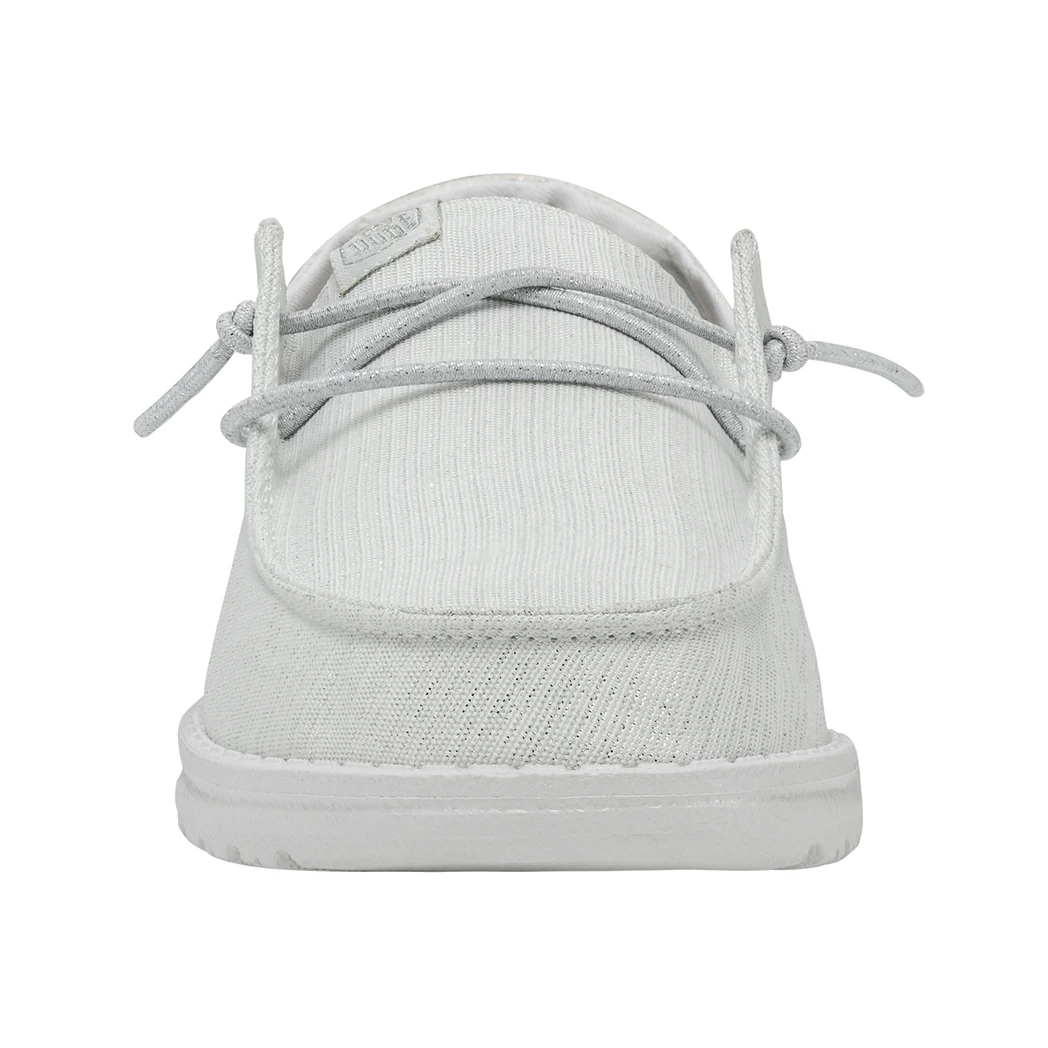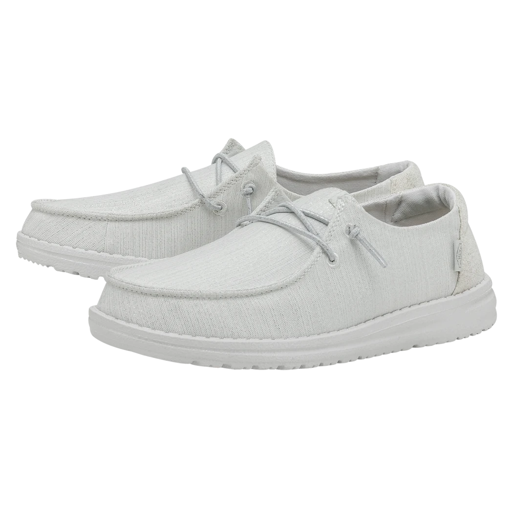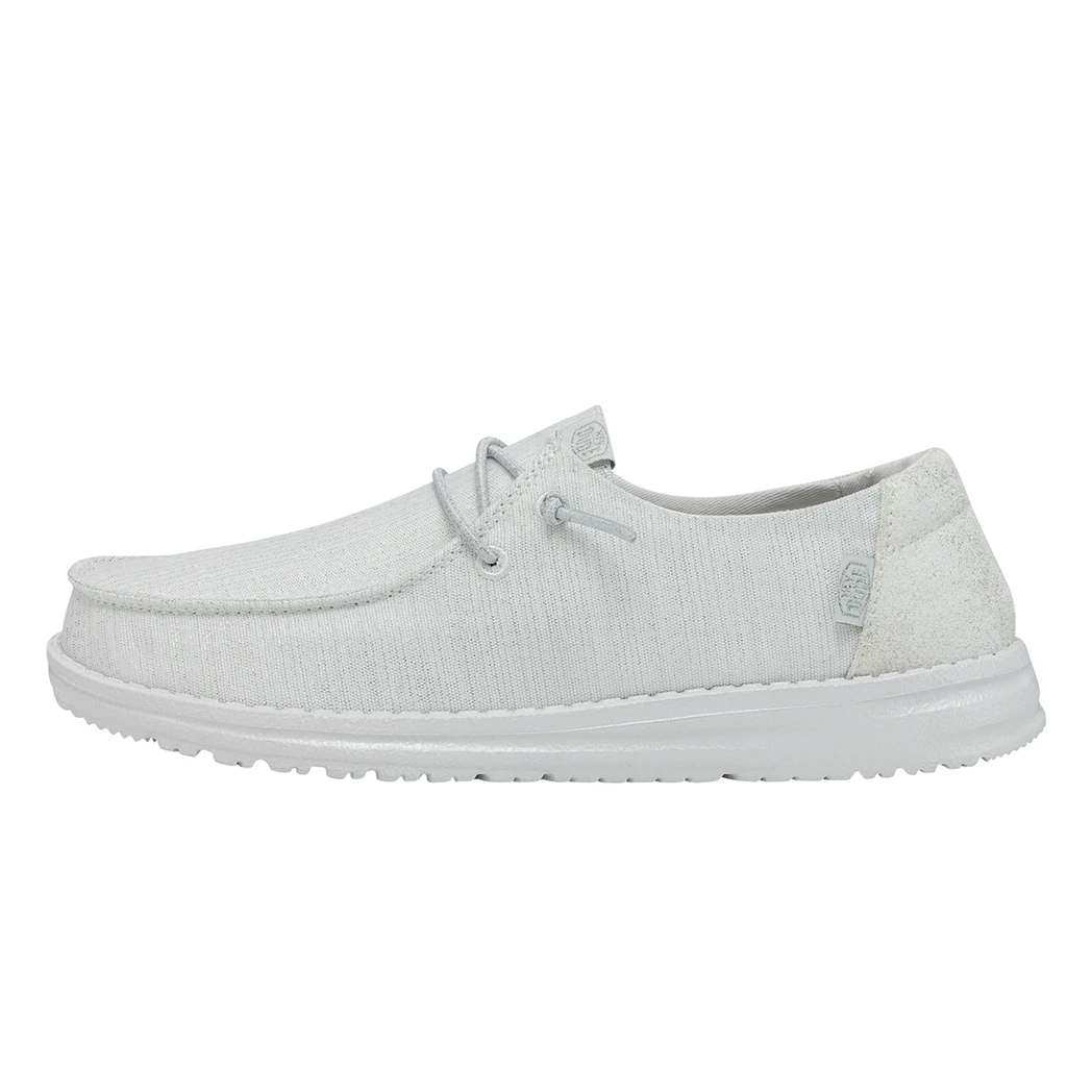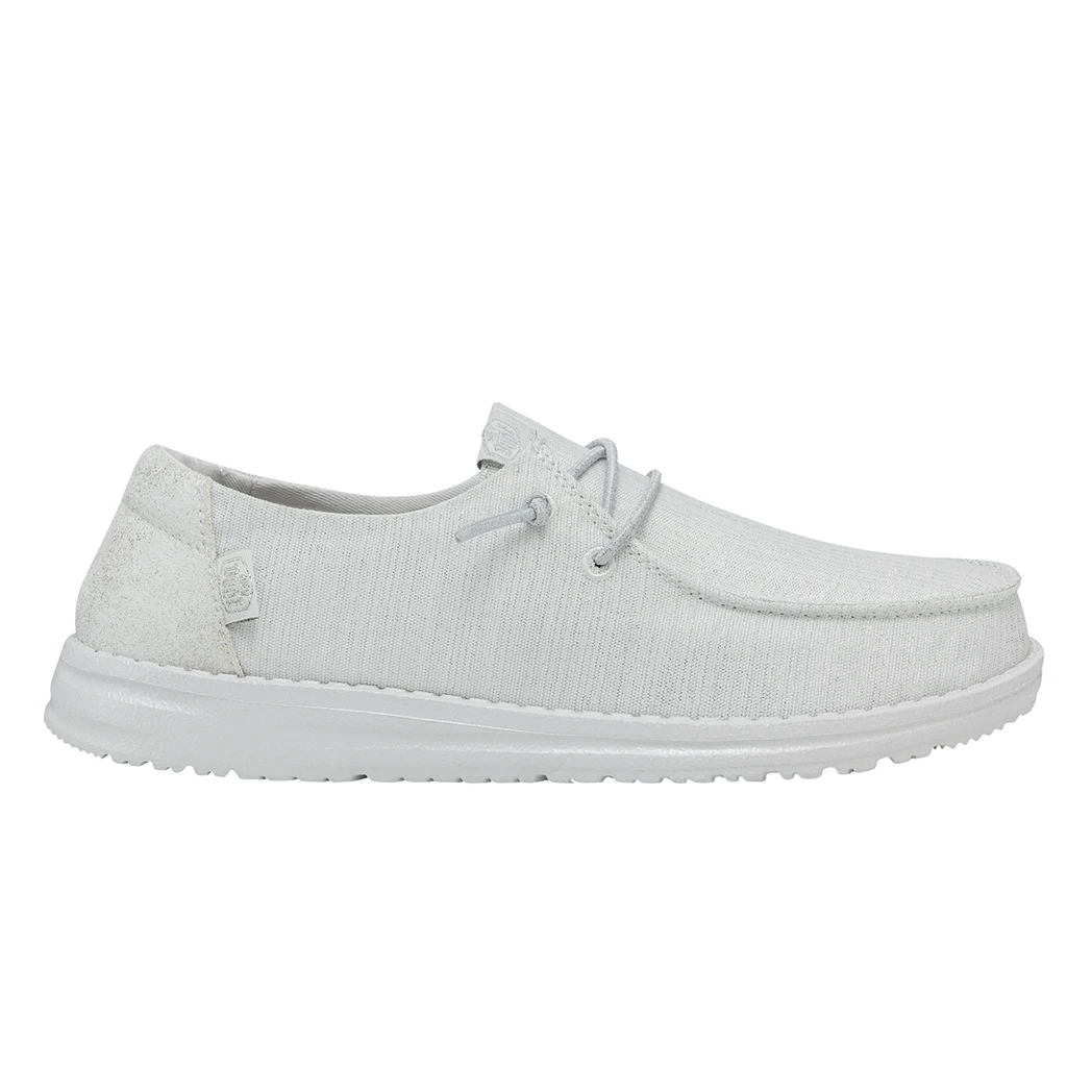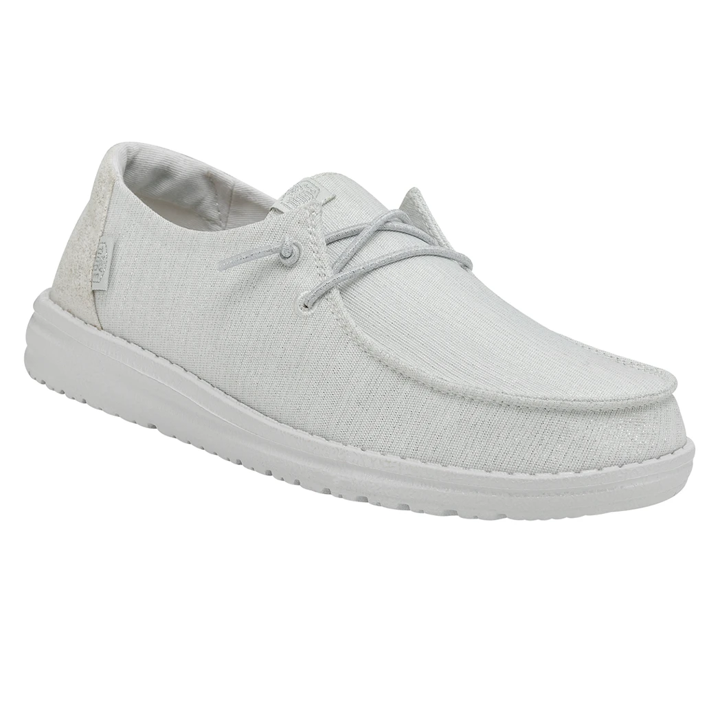 The Hey Dude Wendy Glitter Cloud Dust was made to shine. Perfect for Spring and Summer, this shoe is made of a durable, metallic textile upper in front and features a fun glittery heel. Lined with a light cotton-blend lining, easy-on, elastic lacing, ultra lightweight outsole, this shoe is stylish and comfy!Â